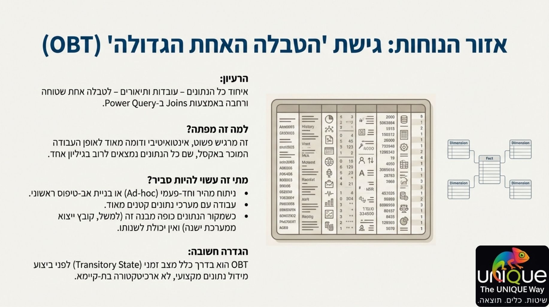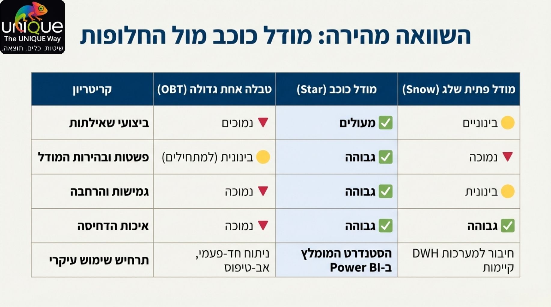 אשווה בין גישות שונות, כמו הטבלה הרחבה (On Big Table – OBT) ופתית השלג (Snowflake), ונראה מדוע הן פחות מומלצות לשימוש שוטף בשל פגיעה ביעילות המנוע הפנימי.