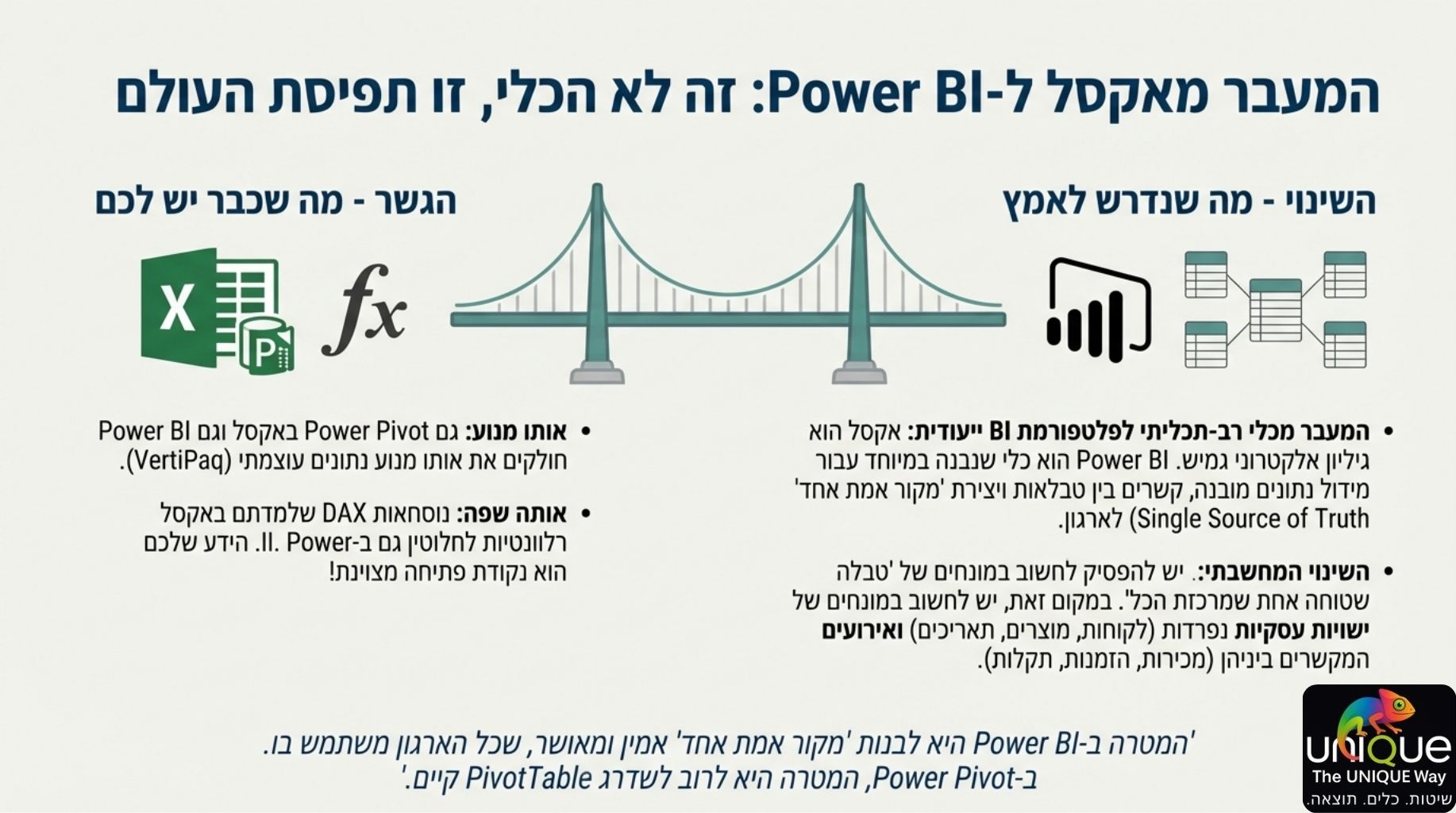 מאמר זה בעיקר מנסה להנחות את המשתמשים העוברים מאקסל ל- Power BI או לשימוש ב Power Pivot לאמץ תפיסת עבודה מובנית המבוססת על קשרים לוגיים ולא על גיליונות שטוחים.