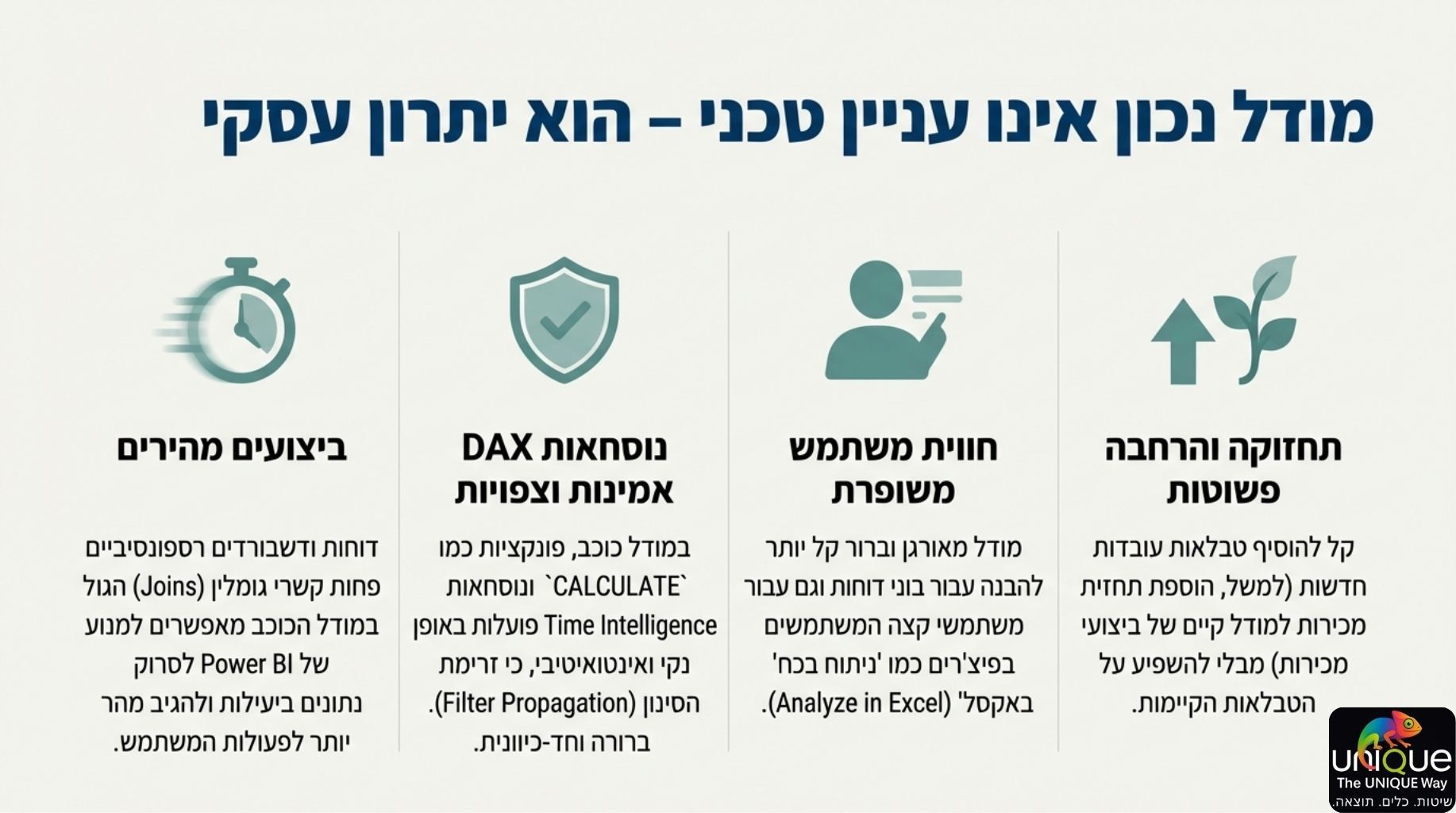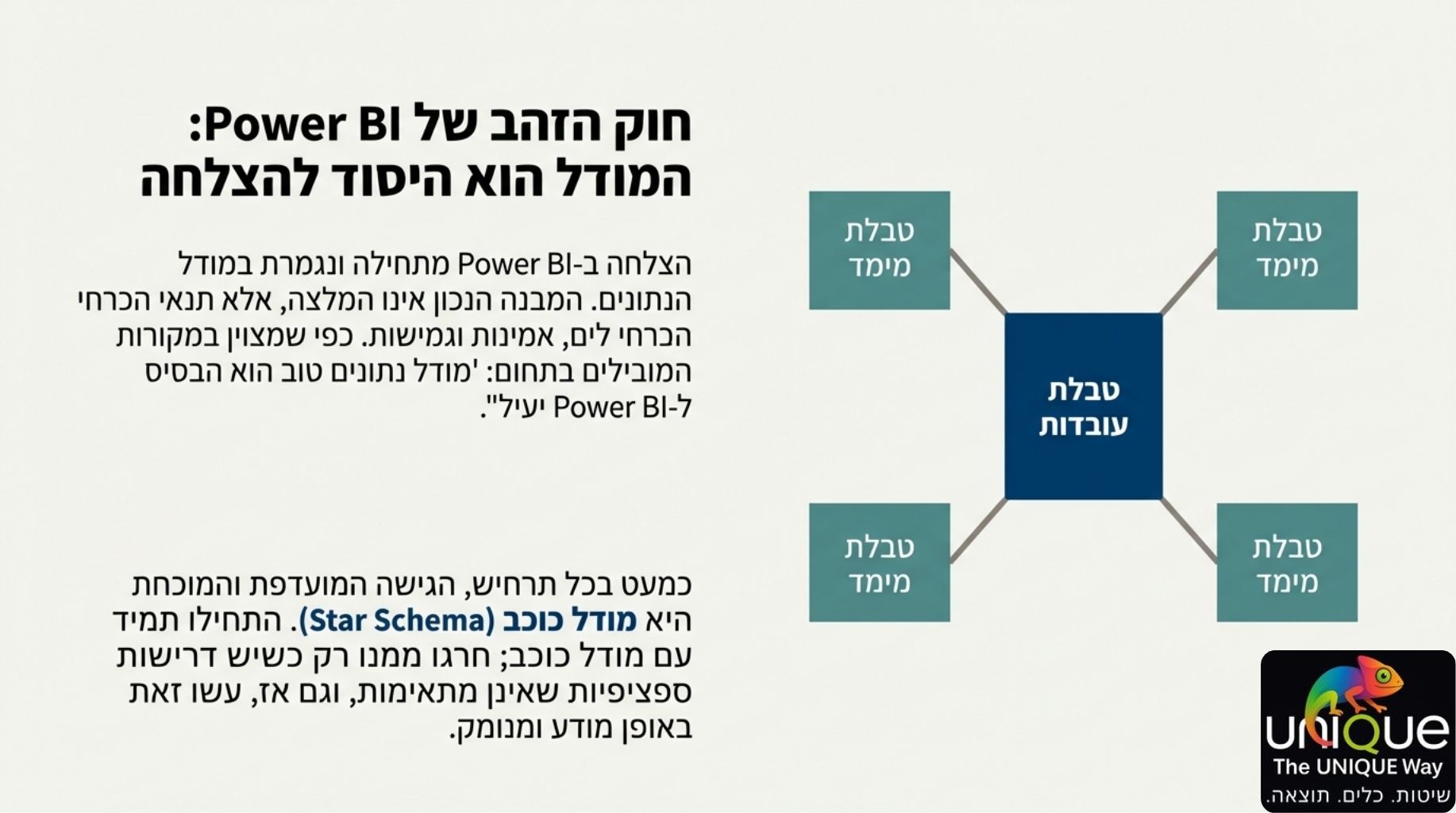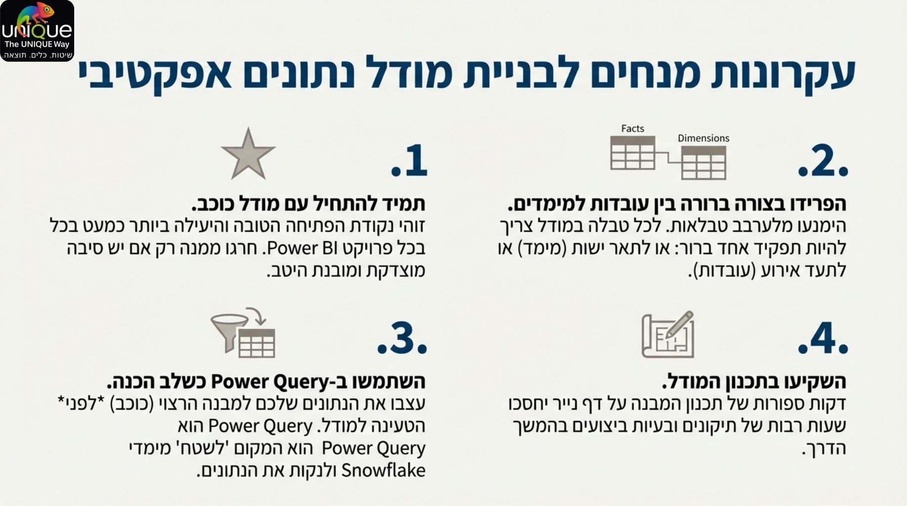 הצלחה ב-Power BI מתחילה ונגמרת במודל הנתונים. מודל נכון אינו רק עניין טכני – הוא יתרון עסקי המאפשר ביצועים מהירים, נוסחאות DAX אמינות וחוויית משתמש משופרת.