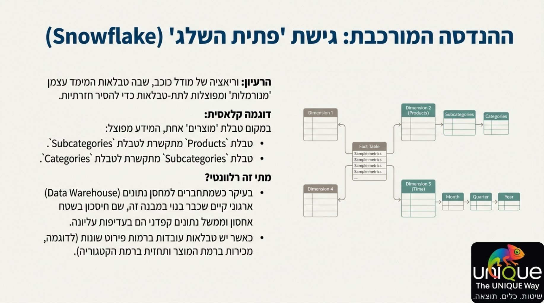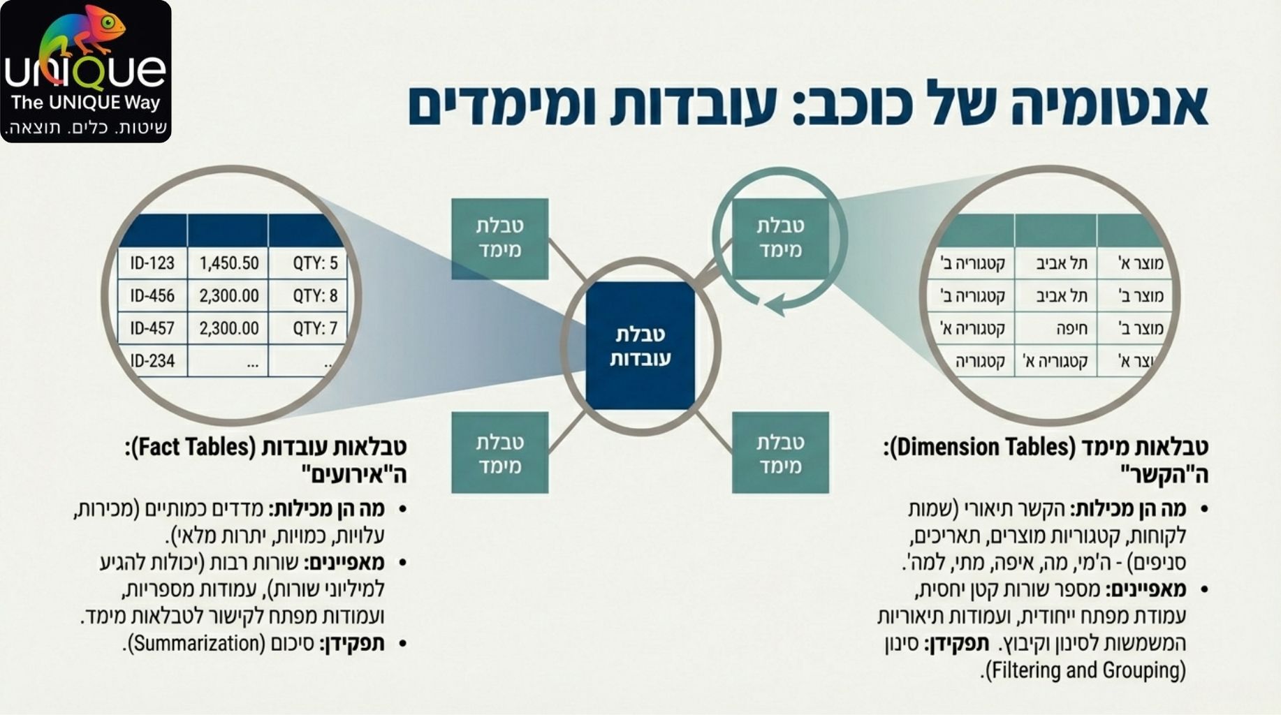 • טבלאות עובדות (Fact Tables): מרכז המודל, מכילות את הנתונים הכמותיים (מכירות, טרנזקציות) ומפתחות לקישור לממדים.