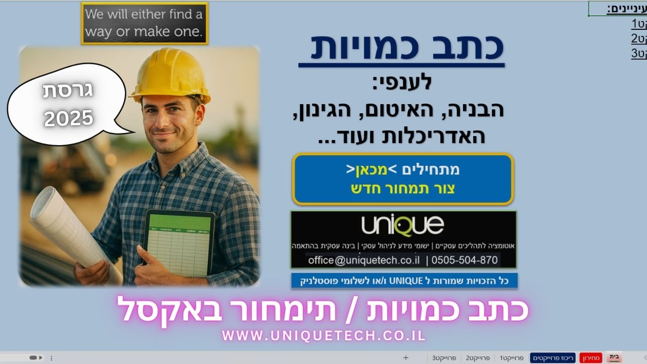 בדיוק בשביל זה פיתחתי קובץ אקסל ייחודי ליצירת כתבי כמויות, שמאפשר לכל אחד – גם בלי ניסיון קודם – ליצור מסמך מקצועי, מסודר וברור.
