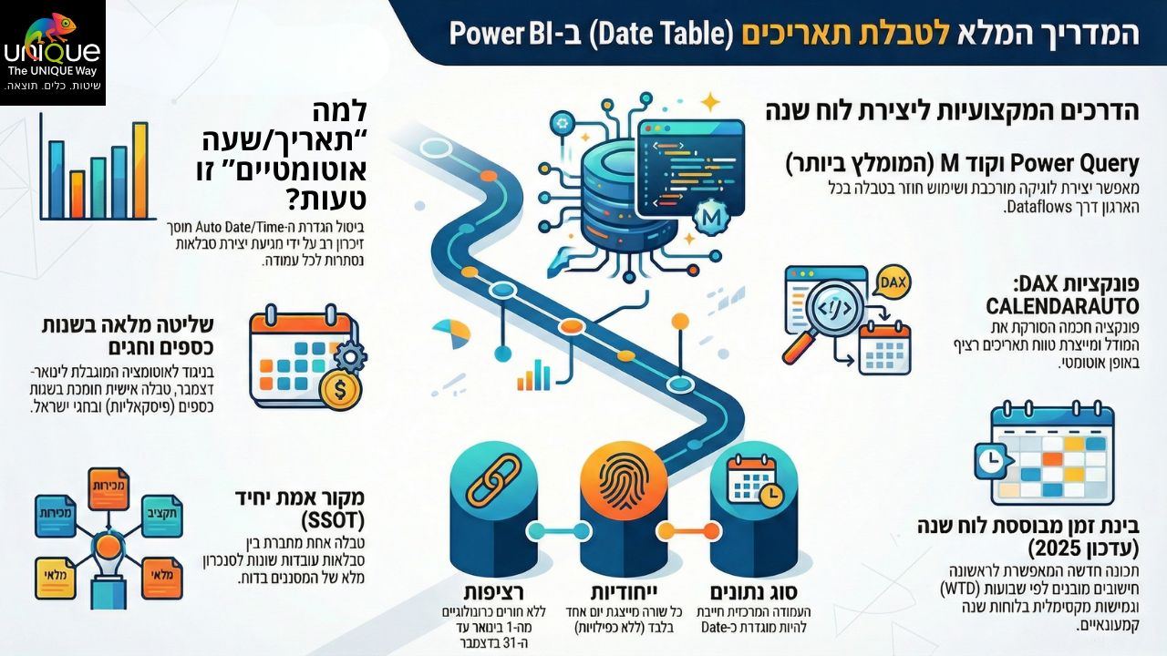 ניהול ממד הזמן הוא אחד האתגרים המורכבים והחשובים ביותר במערכות בינה עסקית (BI). ב-Power BI, טבלת תאריכים (הידועה גם כלוח שנה או Date Dimension) אינה סתם רשימת ימים, אלא עמוד שדרה ארכיטקטוני המאפשר להפוך נתונים גולמיים לתובנות אסטרטגיות. ללא הבנה עמוקה של תפקידה, מפתחי דוחות ימצאו את עצמם נאבקים בחישובים שגויים, ביצועים איטיים וחוסר עקביות.